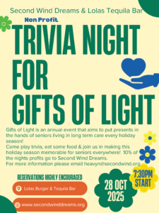 Support the Gifts of Light program designed to provide seniors in nursing homes with gifts during the holiday season by joining us on Oct. 28 for Trivia Night at Lola's in downtown Roswell, GA. Contact Heavyn at heavyn@secondwind.org for more information or to reserve your table.
